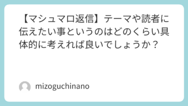 【マシュマロ】創作・アイディア 【マシュマロ返信】テーマや読者に伝えたい事というのはどのくらい具体的に考えれば良いでしょうか? 私も以前、「何が伝えたいのかわからない」と言われて、どうしていいかわからなくなってしまったことがあります「伝えなきゃ」と思うほど、頭で考えすぎてしまって、いつの間にか“情報を伝えること”に寄ってしまっていたなと、今は思います。でも本当は、伝... 2026.01.02 【マシュマロ】創作・アイディアマシュマロ質問箱